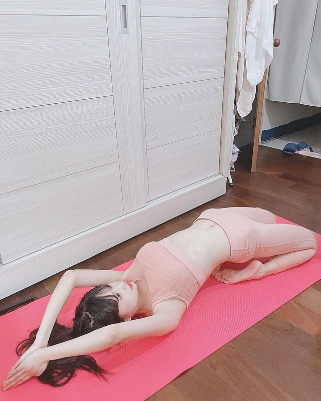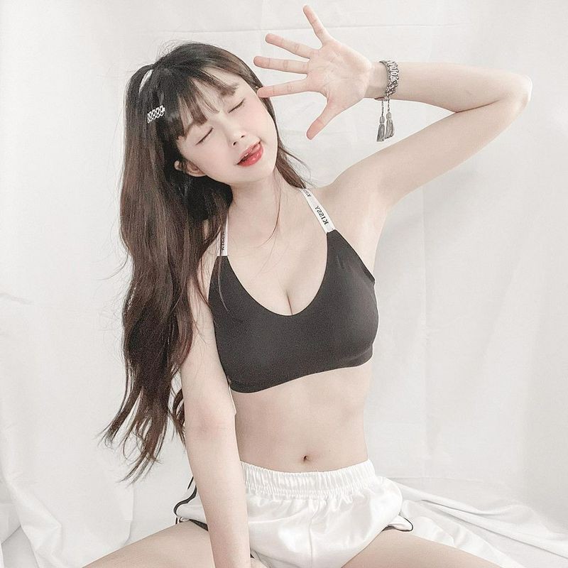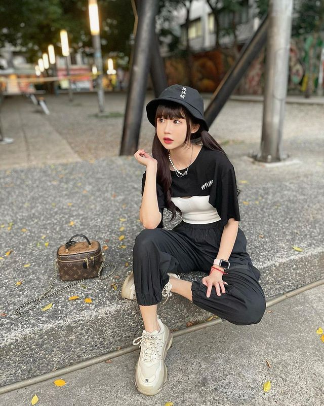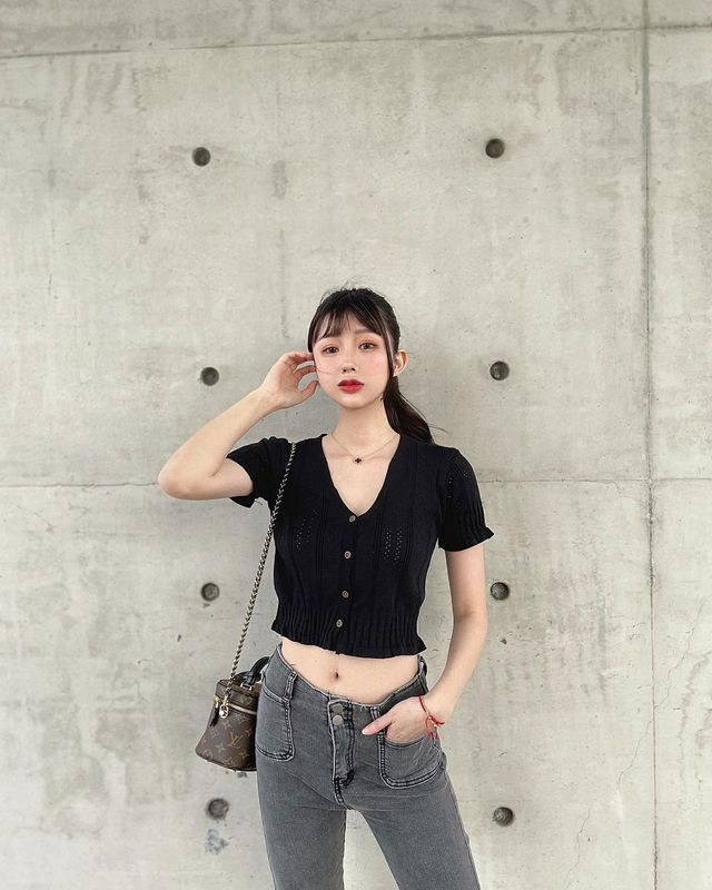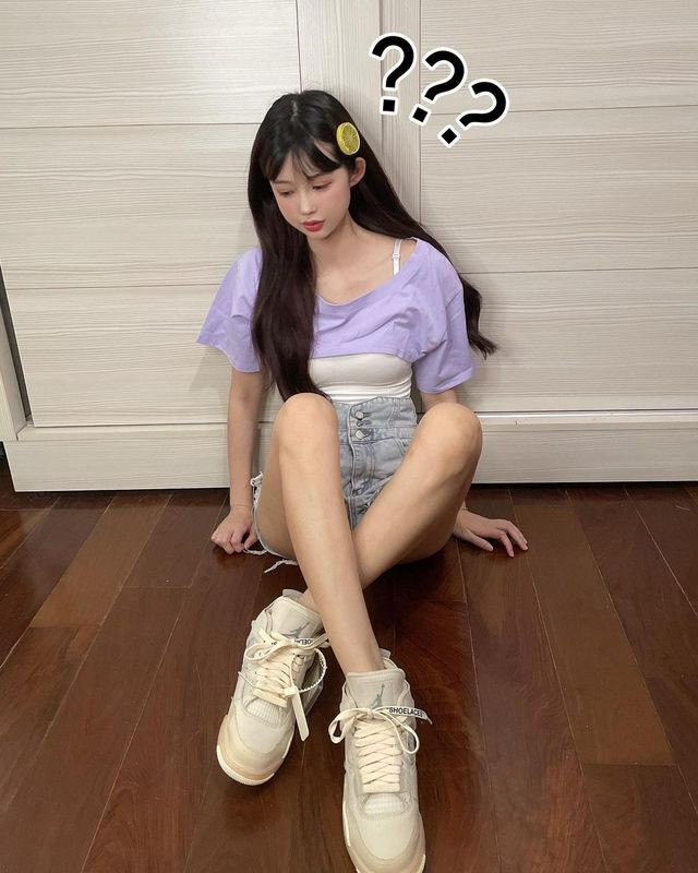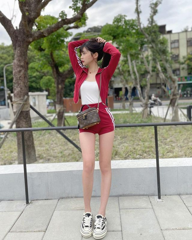 模特@林星阑, 性感淡蓝色上衣搭配深色运动裤